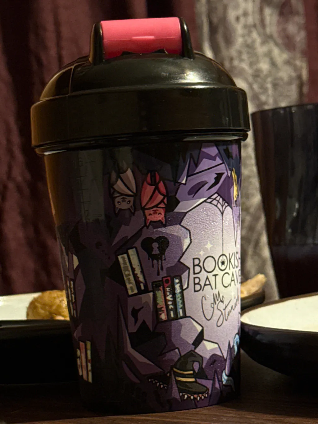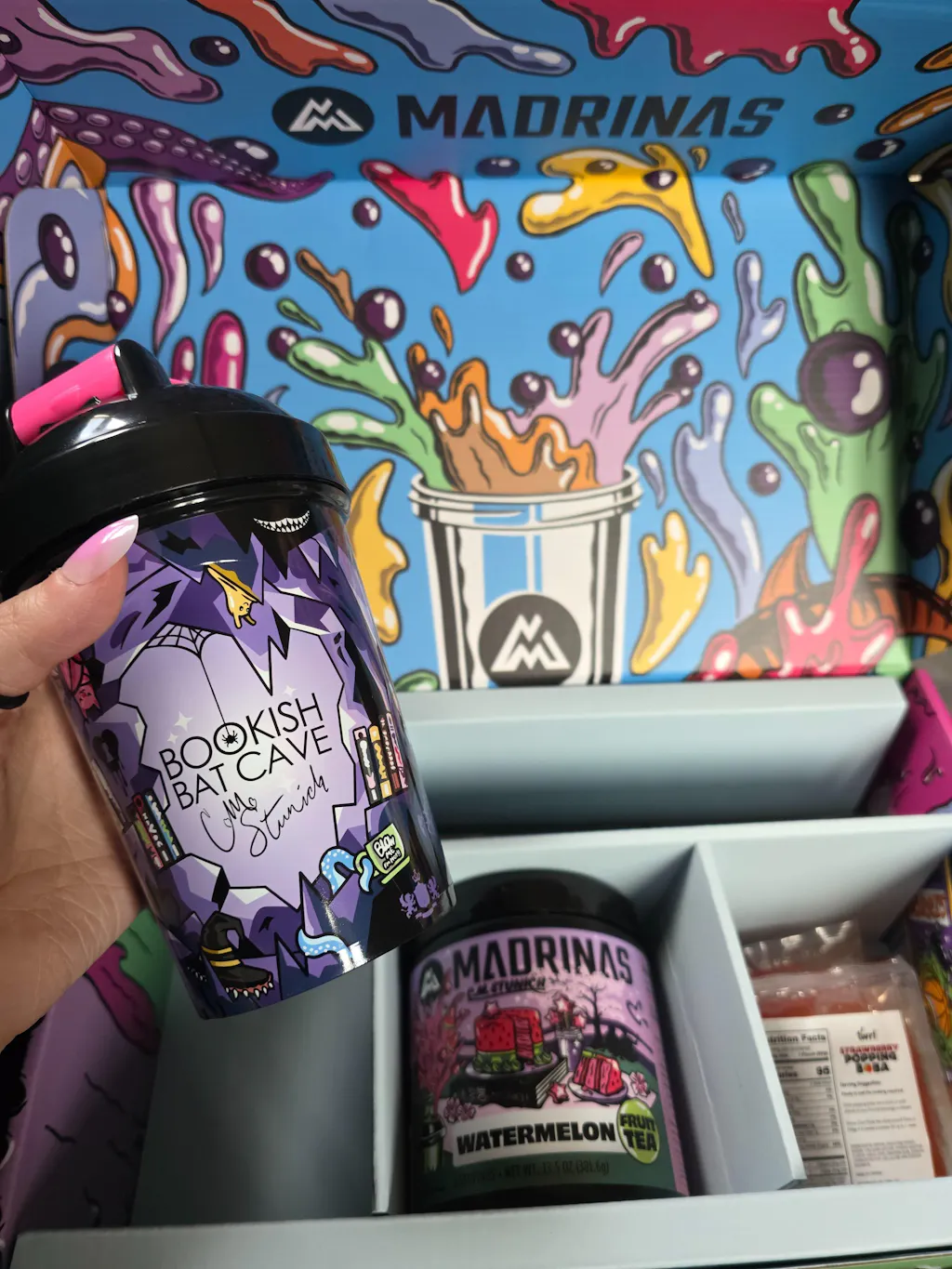 As an avid reader who loves CM Stunich books, bats, and tea, as soon as I saw the ad for this bundle I was hooked. It took a long time to arrive, but when it did, I didn't hesitate to shake some up. The cup has a beautiful design, and the tea and boba are delicious! I can't wait to buy some more flavors!